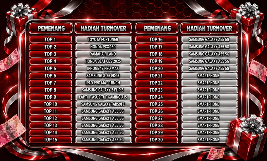 - Peringkat dihitung berdasarkan akumulasi TURNOVER SLOT di periode bulan sebelumnya dan perhitungan TurnOver dimulai dari tanggal 1 pada pukul 00:00 WIB dan berakhir pada pukul 23:59 di Akhir Bulan